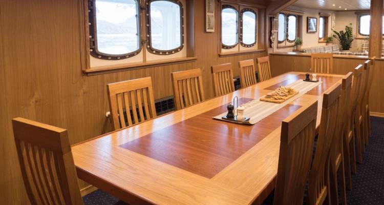 The dining area on the main deck is where you are served breakfast, lunch and dinner. Here is also a lounge area where you can relax with a cup of tea or coffee and listen to interesting talks by the guides.