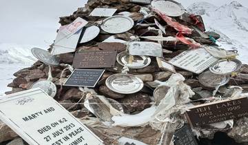 Trek 6-8 hours for 13.5 km up to K2 Base Camp at 5,000-5,135 m. You'll be surrounded by mountains above 6,000 m, 7,000 m, and 8,000 m including K2, Broad Peak at 8,047 m, and Golden Throne at 7,240 m. After spending time at base camp, you'll head back down to Broad Peak Base Camp for the night.